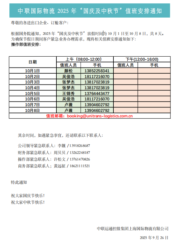中联国际物流2025年“国庆及中秋节”值班安排通知
