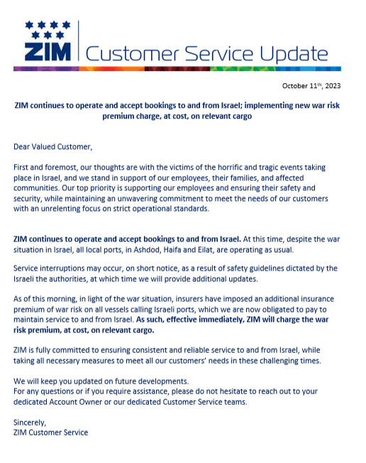 ZIM - /NOTICE/ Customer communication message - War situation in Israel